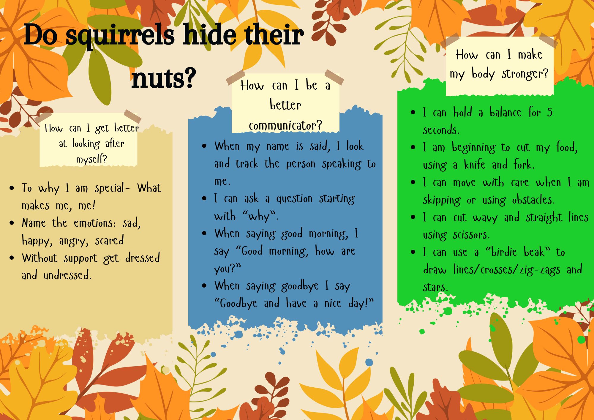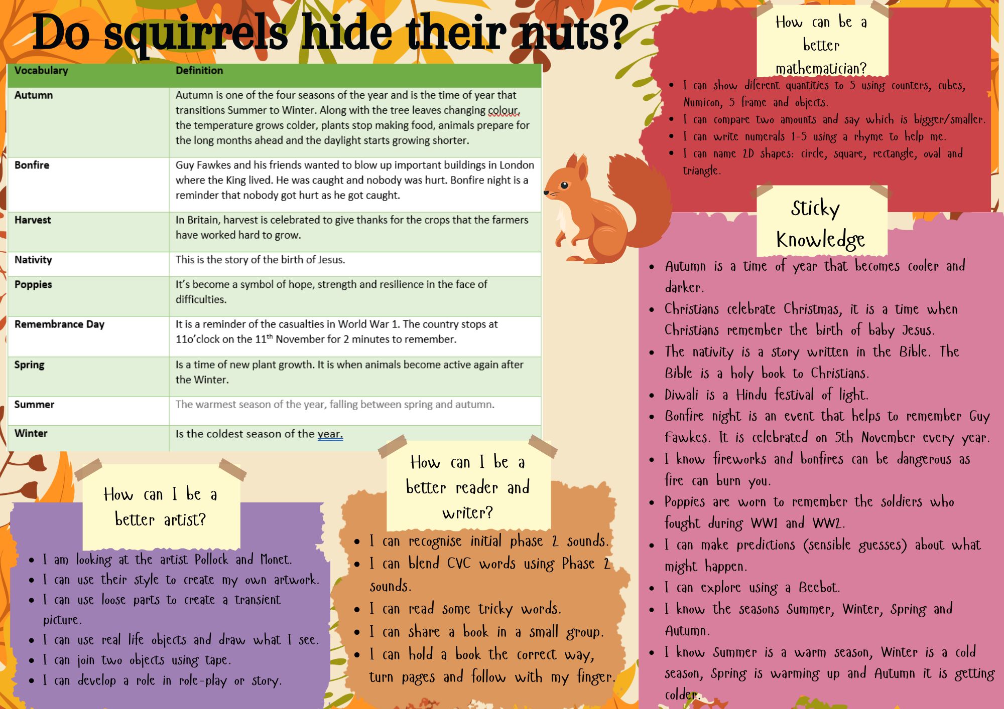 Our topic is 'Why do squirrels hide their nuts?' This term we will continue to explore seasonal changes in the natural world and explore what animals do during the Autumn and Winter months. We will share and explore the Percy the Park Keeper stories and books. We will help Percy prepare for the winter months and made sure all the woodland animals have everything they need. We will explore seasonal celebrations and festivals including Bonfire Night and Remembrance Day. We will became storytellers and retell the story of Dear Zoo and have a go at being authors creating our own Dear Percy story.
