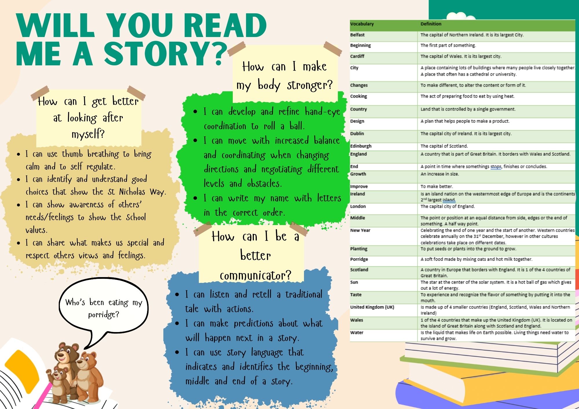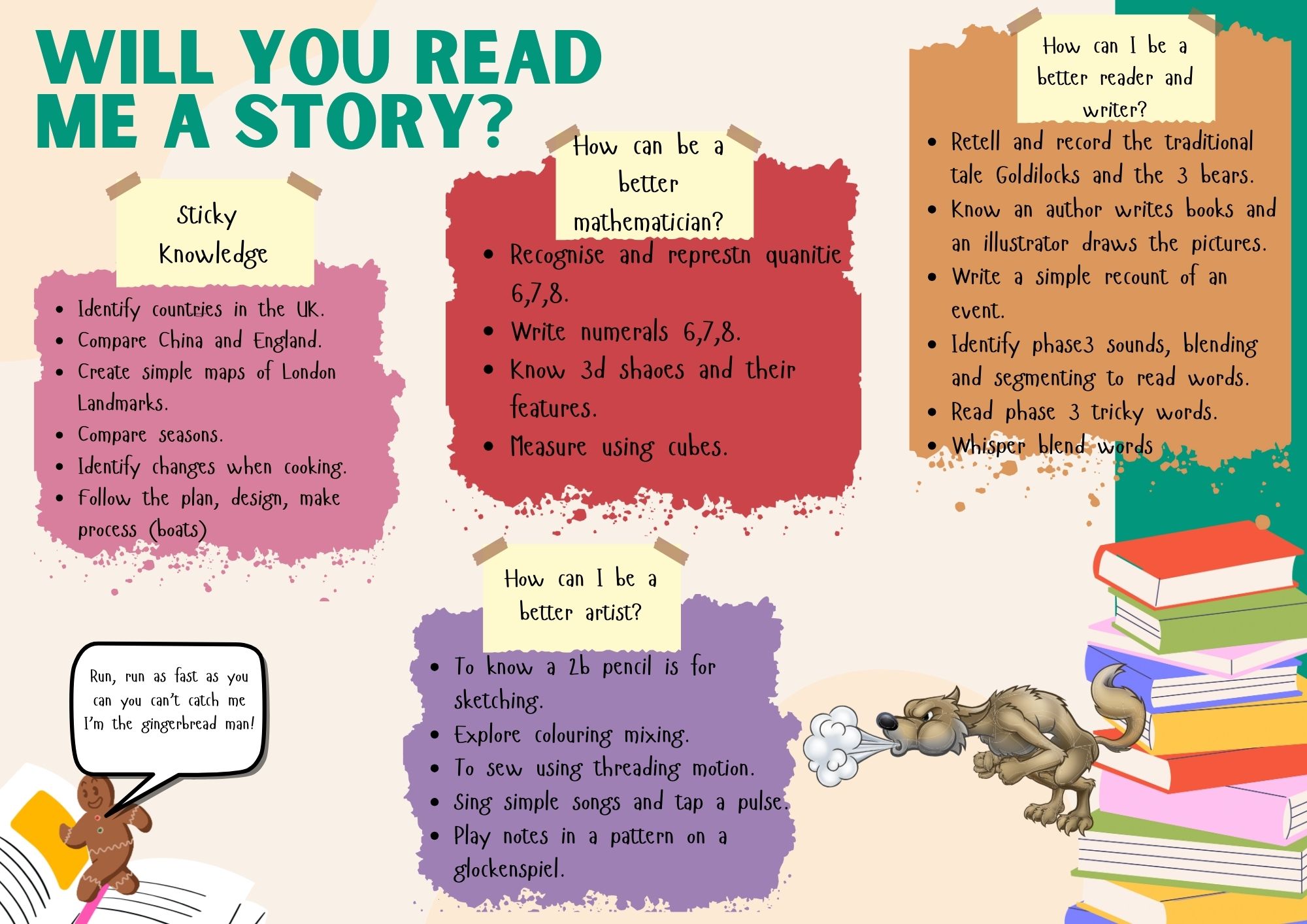 Our topic is ‘Will you read me a story?’ During our magical topic all about fairy tales, goodies and baddies, we share a range of traditional tales and explore various questions like… Is the Big Bad Wolf really so bad? How many bowls of porridge does Goldilocks eat?