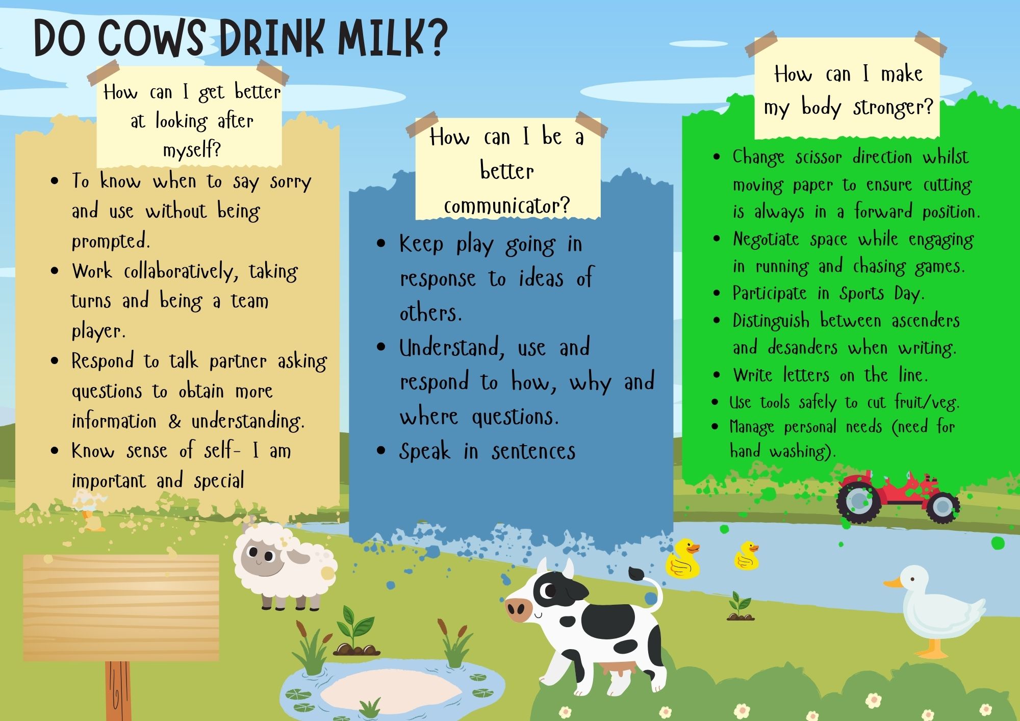 Our topic will be “Do Cows Drink Milk?”. During this action-packed topic we will explore farm life and learn how different foods are grown. We will also look back in time through our history eyes to identify how farm machinery has changed over time, and we will complete “now and then” activities linked to farm life.