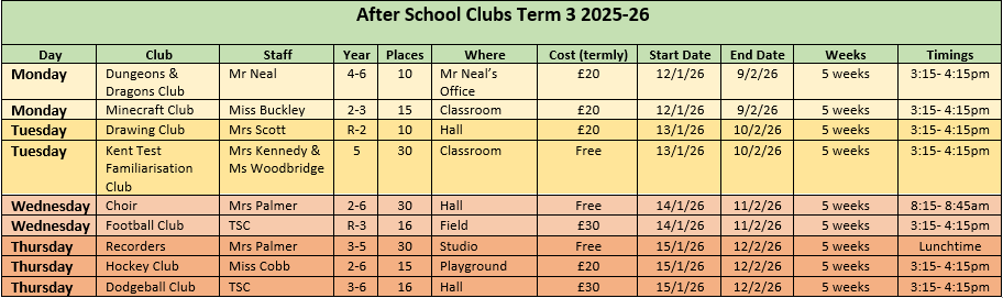 After-school clubs have limited spaces. Sign-up forms are sent out online via the office.