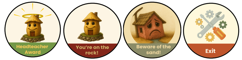 All children begin on the solid rock, and we focus on recognising and encouraging the behaviours we want them to notice and strengthen. When children demonstrate exceptional behaviour, they can earn a Headteacher’s Award, where they receive praise, feedback, and a certificate. Our visuals help children understand that their choices shape their future. If a child is in danger of slipping onto the sand, the teacher supports them with strategies to help them return to the rock, ensuring the approach remains positive, supportive, and growth-focused.