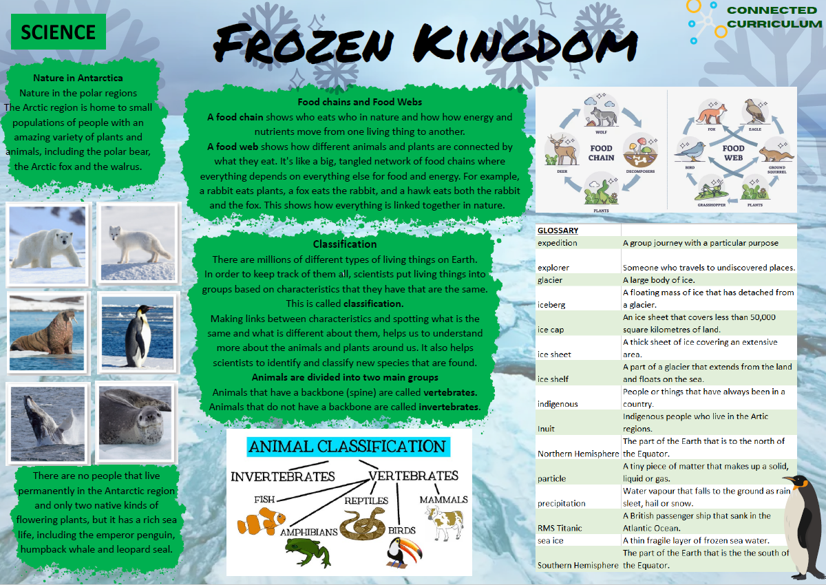 Welcome to the planet’s coldest lands. Vast wilds and hostile territories; incredibly beautiful, yet often deadly. Take shelter from the elements or fall prey to icy winds and the deepest chill. Trek bravely and valiantly across treacherous terrain to the ends of the Earth, treading deep in snow or being pulled by a team of mighty sled dogs. Be alert, for magnificent mammals roam these lands, sometimes hungry or fresh for a fight. Perhaps a hungry polar bear or an Arctic fox is hunting rodents, as swift as the wind. Research facts and figures of climate, temperature, habitats and ecosystems, and compose evocative poems about the Northern Lights. Become part of an Antarctic rescue team, braving the elements to rescue terrified passengers from a ship struck by a deadly iceberg that hides deep beneath the Southern Ocean. Wrap up well and settle by the fire. I’m just going outside and may be some time.
